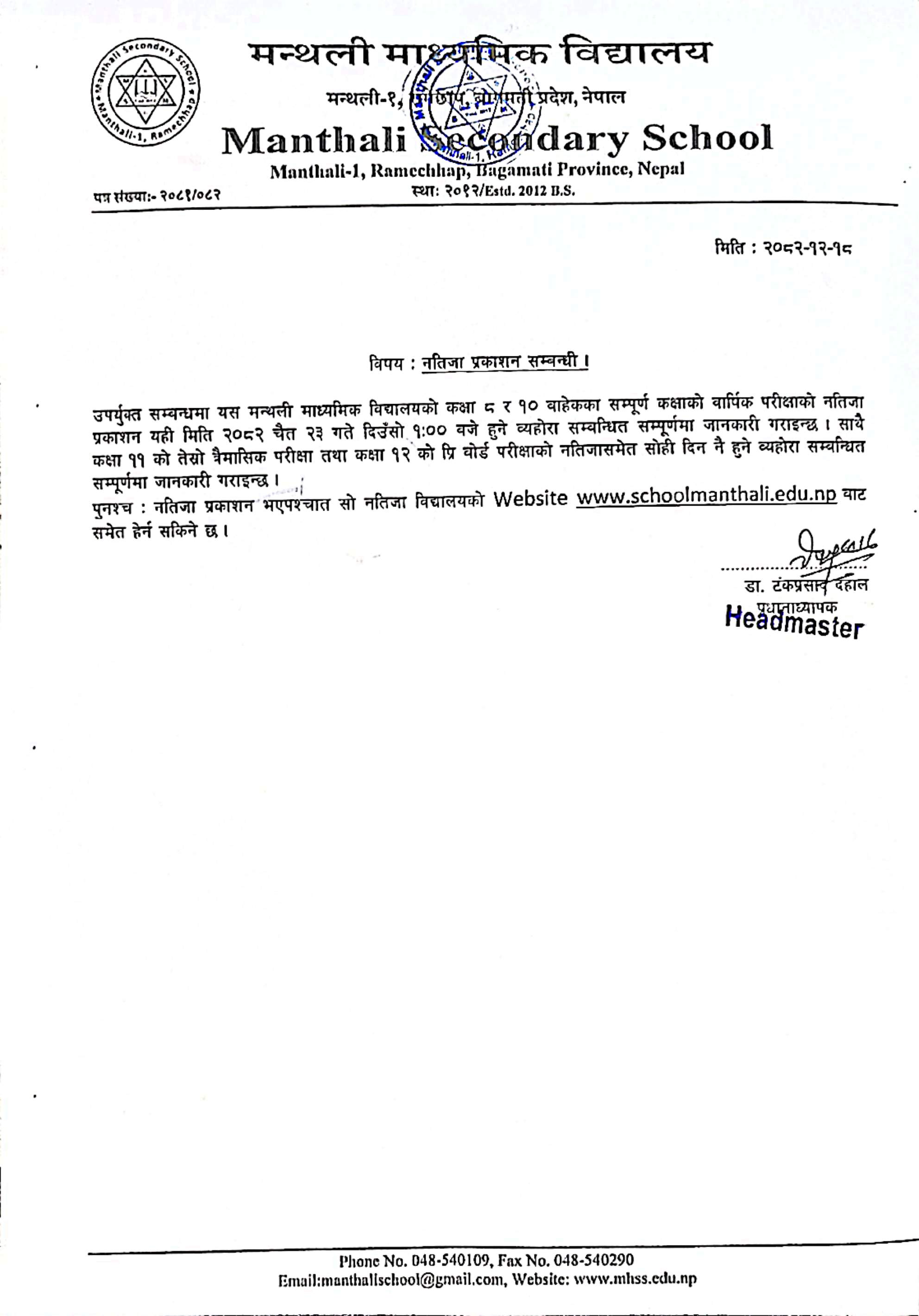 "At shree manthali secondary school, we believe education should ignite curiosity, foster resilience, and prepare students not just for college, but for life. Our dedicated faculty works tirelessly to create an environment where every student feels valued and challenged."