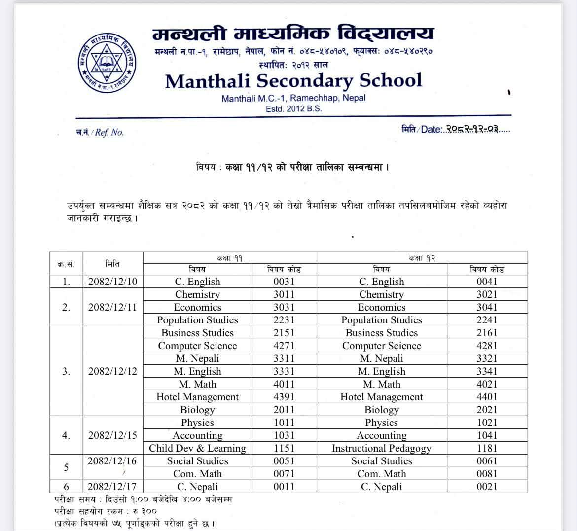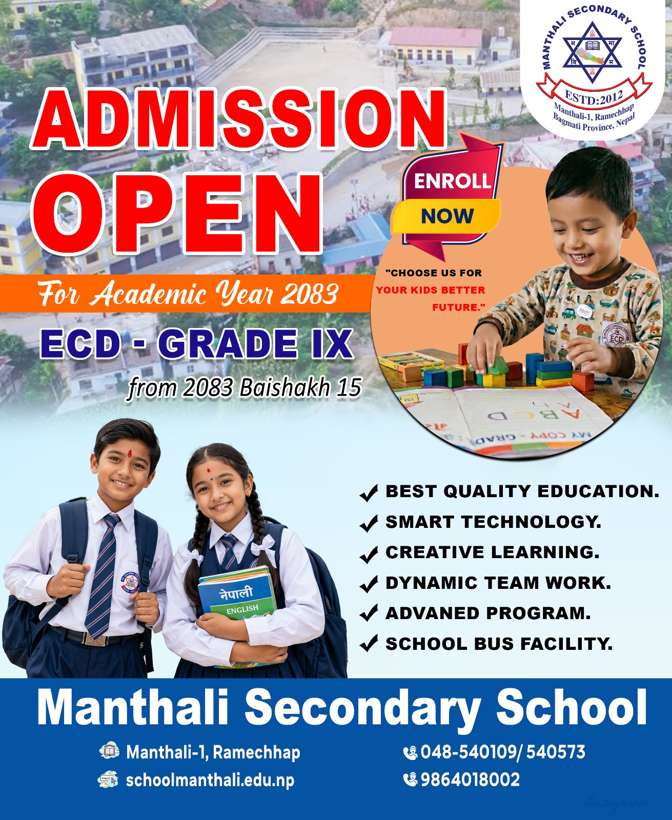 ЁЯЪА *Admission Open* & *Form Distribution Started* at _Manthali Secondary School_ for ECD тАУ Grade IX, Academic Year 2083! ЁЯОУЁЯУЪ Enroll from Baishakh 15 & give your child *Best Quality Education*, Smart Technology, Creative Learning, Dynamic Teamwork, Advanced Programs & School Bus facility. Choose us for your kidsтАЩ better future! ЁЯУН Manthali-1, Ramechhap | ЁЯУЮ 048-540109 / 540573 | 9864018002 | ЁЯМР schoolmanthali.edu.np #AdmissionOpen #FormDistribution #EnrollNow #QualityEducation #ManthaliSchool ЁЯЪНЁЯСзЁЯСжтЬи